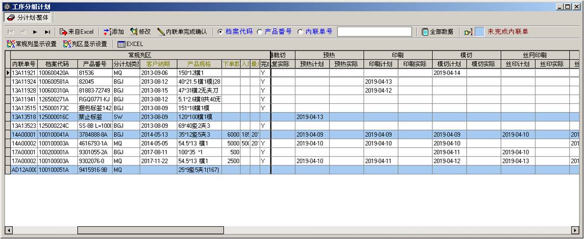 生产分计划:本项目的生产分计划与标准产品的排产在同一阶段。粗能力预估(计划)做出的是班组或设备分组整体预估,而分计划需要将这些分组分别落实到每个人和每台设备上,当确定之后即可打印工艺路线单安排备料和生产。目前,这一部分现在已经与MES相结合实现了生产进程的监控。界面如下图: